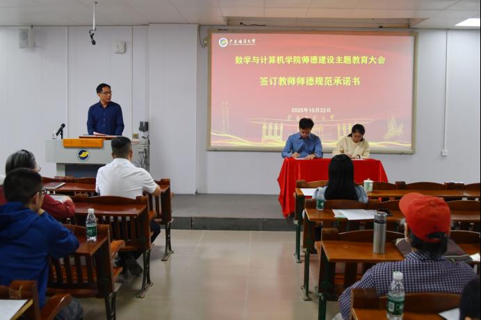 为明确职业规范、筑牢师德底线,大会第二项议程为签订《广东海洋大学数学与计算机学院教师师德规范承诺书》。该承诺书依据《新时代高校教师职业行为十项准则》制定,涵盖坚定政治方向、自觉爱国守法、传播优秀文化、潜心教书育人等核心内容。仪式上,教师代表上台签订承诺书,全体教职工认真阅读条款后郑重签字。此举旨在通过书面承诺形式,强化教师“立德树人”的使命感,推动师德规范内化于心、外化于行。