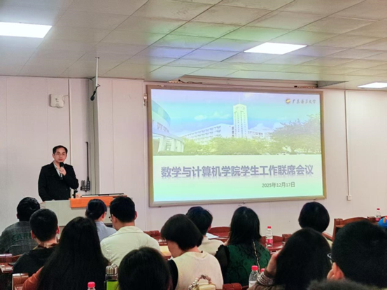 为全面总结学院2025年度学生工作成效,深入分析当前存在问题,进一步提升学生工作的实效性,2025年12月18日下午,数学与计算机学院于明德楼A103会议室召开学生工作联席会议。学院各系正副主任、全体辅导员及班主任参加会议,会议由学院党委副书记农康主持。